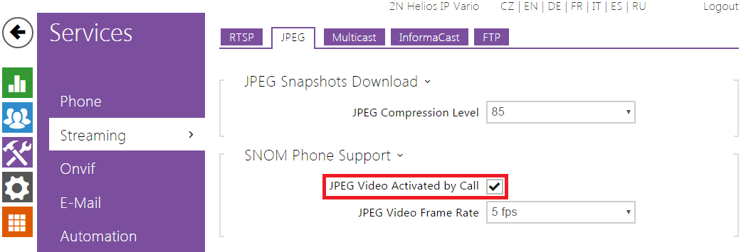 In next step go to section "Services->Streaming->JPEG" and enable "JPEG Video Activated by Call" to enable video activation before answer.