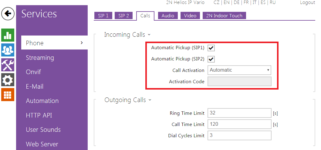 In this step set the intercom to automatic pickup of incoming calls. Go to section "Services->Phone->Calls". Configure the section based on picture below.