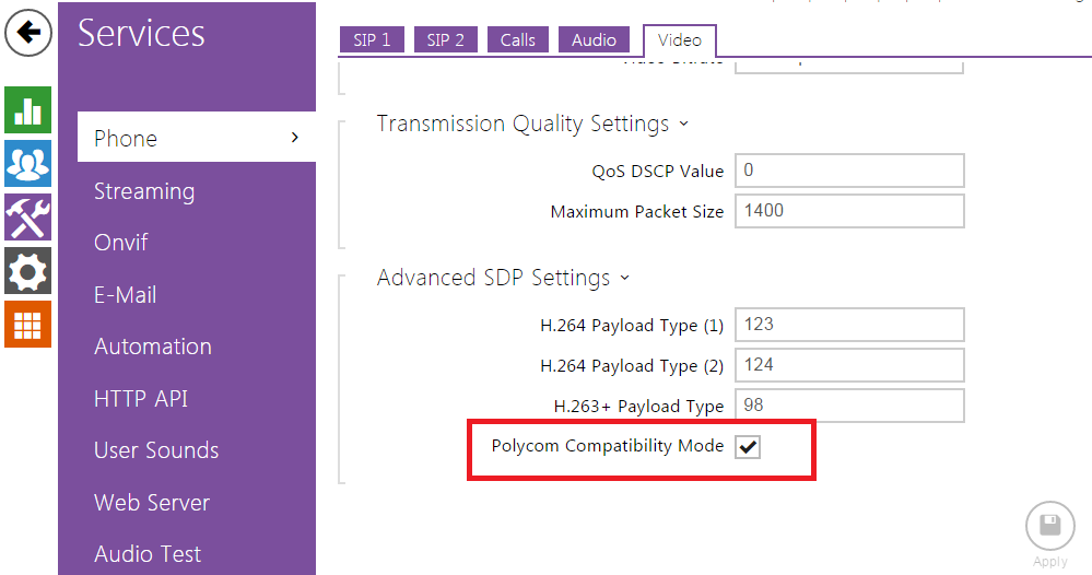 - at first go to Services / Phone / Video and enable parameter Polycom Compatibility Mode according to the picture below