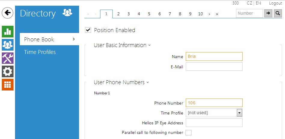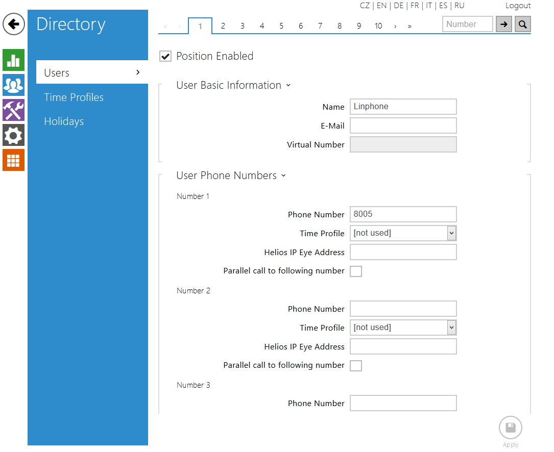 Enable one of the quick dial button position. When it is enabled, specify position name and phone number of the Linphone client.