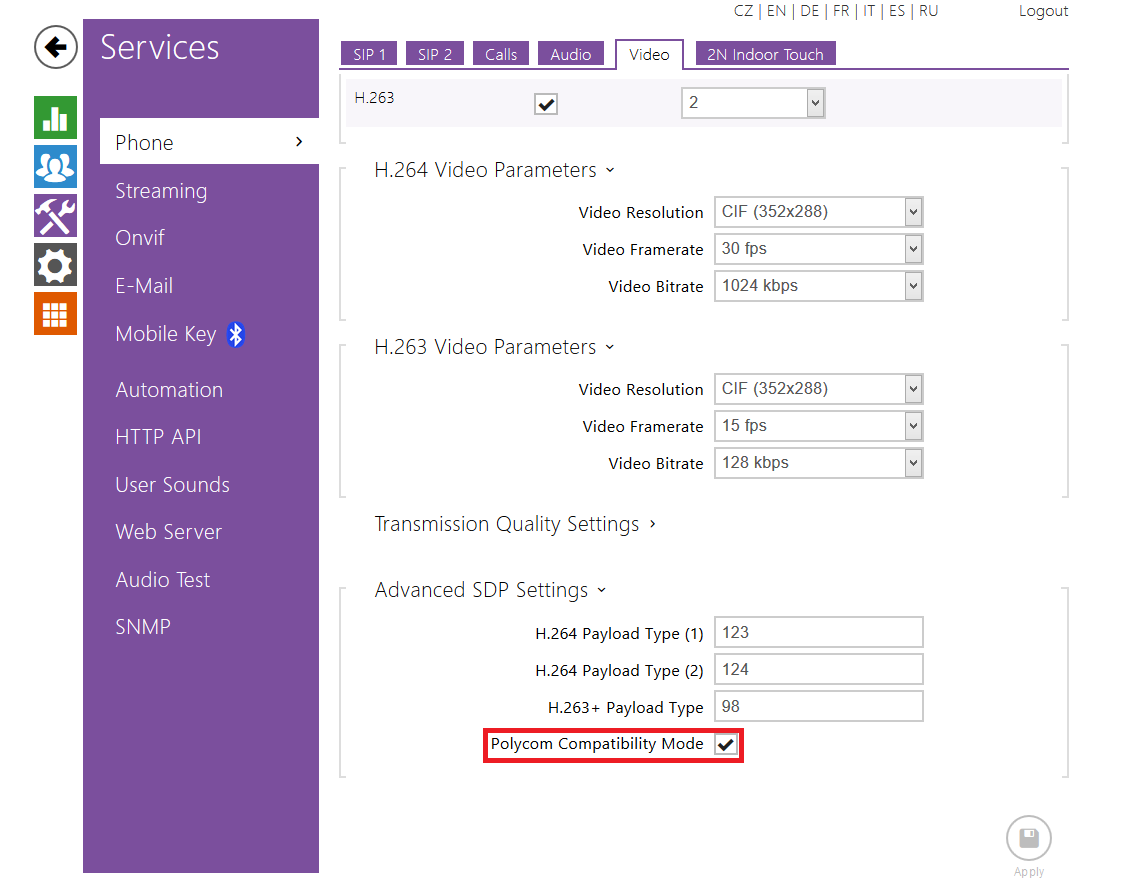 For video, set RTP Payload type (1) to 99, RTP Payload type (2) to 0 in the Advanced Settings / Video Codecs menu.