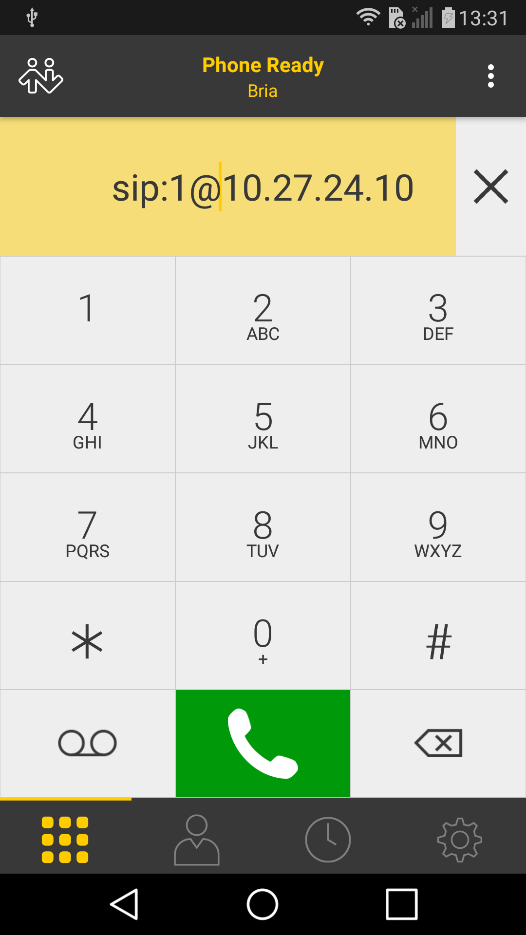For direct call go to Dialer through Dial pad icon and in tho the upper grey line write down the sip:x@ip_address, where ip_address is IP address of your intercom. On the picture IP address is 10.27.24.10. and x some random number for example 1.