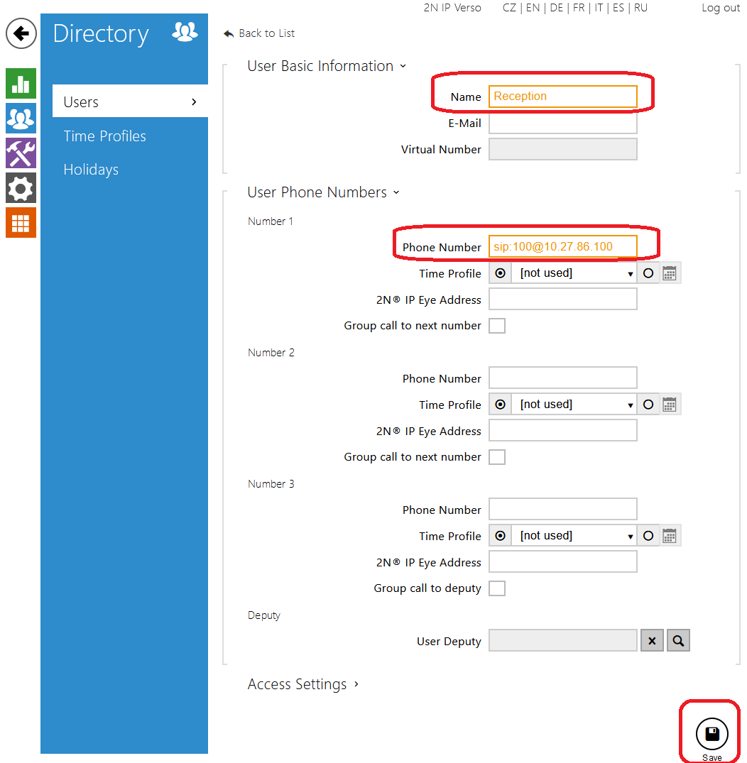 Enable one of the quick dial button position. When it is enabled, specify position name and phone number of the Linphone client. Set the user in Directory / Users to dial direct IP call according to Linphone settings. Linphone has an ip address 10.27.86.100, set the Phone Number to sip:100@10.27.86.100 – see the picture below.
