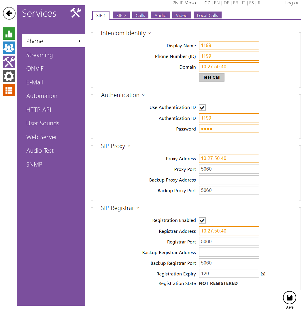 To set your 2N IP Intercom to communicate with SIP over your SIP Proxy (or PBX), you need to fill in credentials like Phone number, password and IP address of your SIP Proxy like in following picture. In this case IP address of SIP proxy is 10.27.50.40 and Phone Number is 1199.