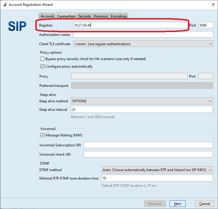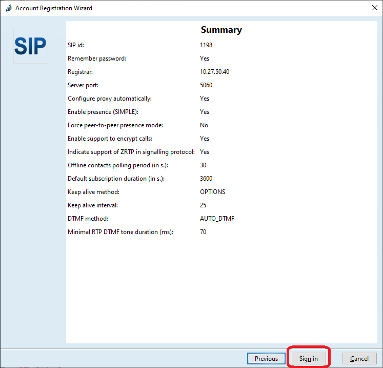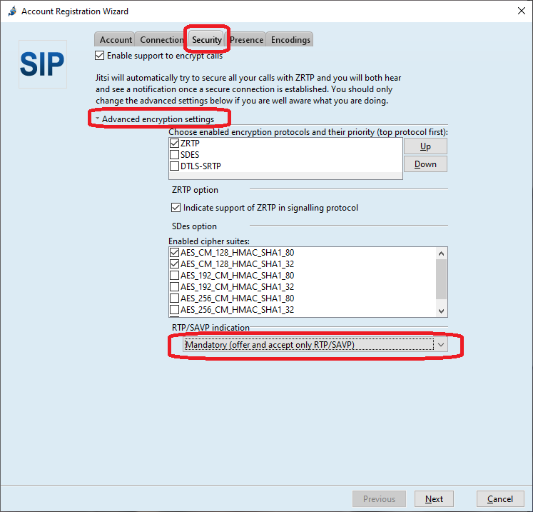 To enable RTP encryption (SRTP) go to Tools / Options / Edit your sip configuration and in in the Security tab expand the Advenced encryption settings. In the RTP/SAVP indication section select "Mandatory (offer and accept only RTP/SAVP)" choice. Click Next and than Sign in.