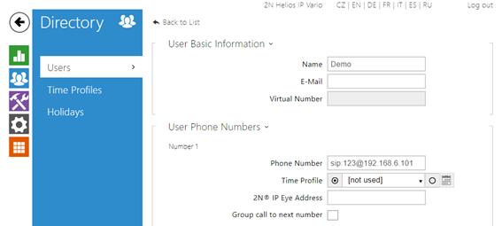 To configure the outdoor devices, it is necessary to create a user, to do this, access the Directory menu.