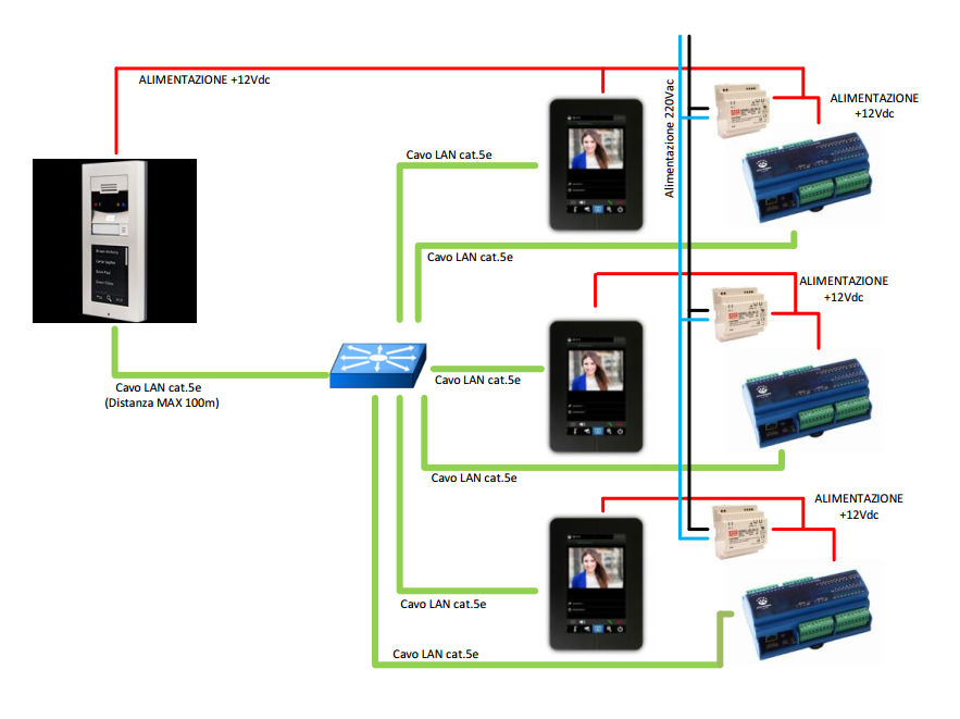 The connection between the Intercom and the KBlue home automation system is via a CAT.6 UDP LAN network cable. The power is supplied to the intercom via a 12Vdc power supply or via PoE.