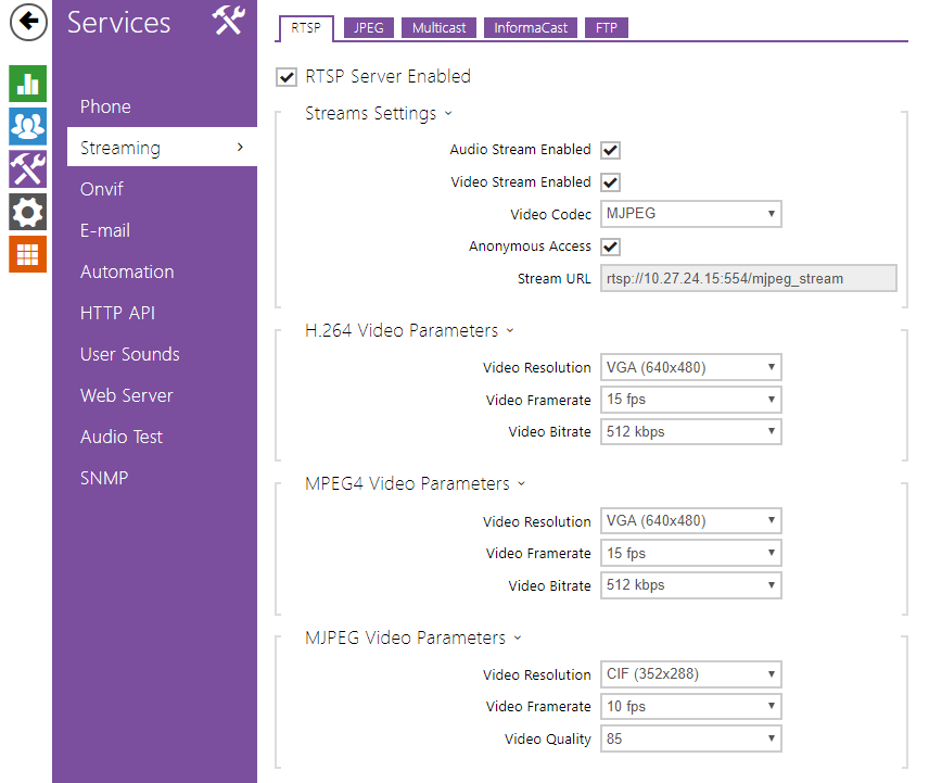 Snapshot http Video mpeg http Video RTSP | Audio via SIP; video via RTSP | No, button in the touch device controls an output of the home automation system. | Snapshot http Video mpeg http Video RTSP | No | No, button in the touch device controls an output of the home automation system. | Yes |