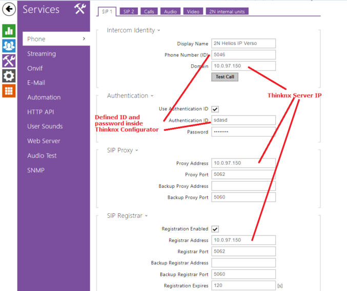 - Set the Authentication ID to the ID of the device inside the Thinknx SIP server (901)