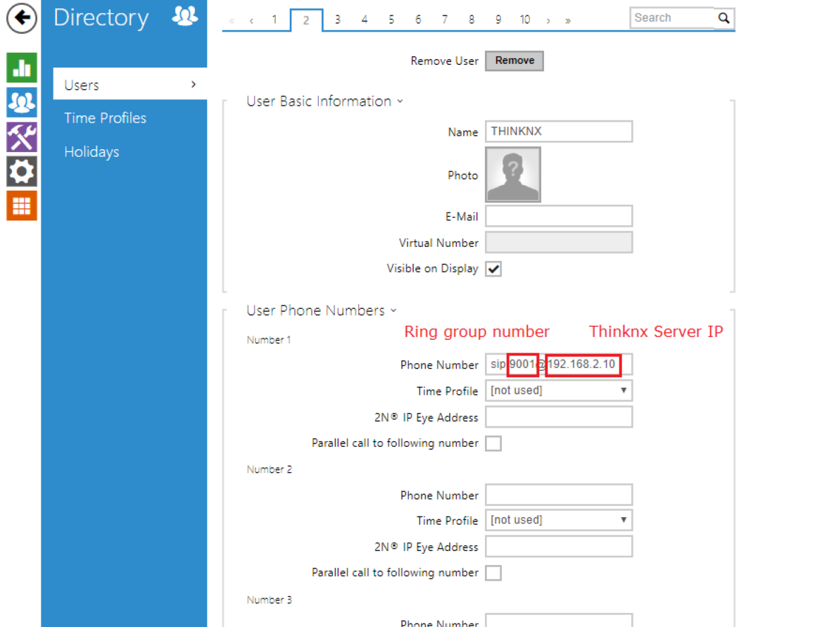 - Under User Phone Numbers→ Number 1→ Phone Number type sip:9001@x.x.x.x, where “x.x.x.x” is the IP Address of the Thinknx Server and 9001 is the extension number to call (ring group in this case).