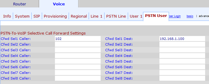 - And PSTN-To-VoIP Selective Call Forward Settings in Voice → PSTN User tab: