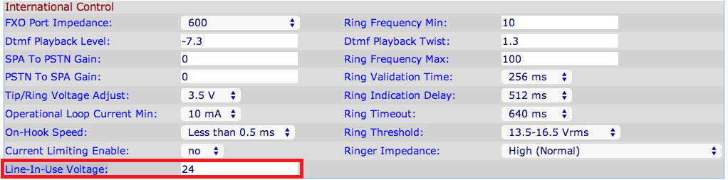In this page you can set voltage for Line-in-use. Set this value about 2V lower then Line Voltage Off-hook.