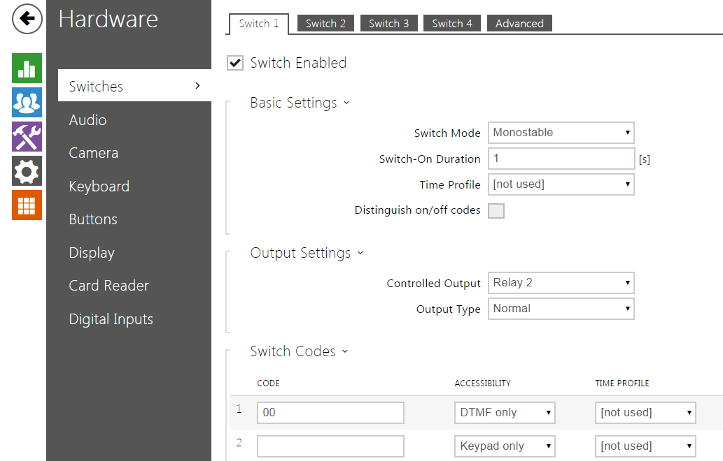 - Last thing is to set up relay contact. You have to enable switch and then you can pick which output you want to control. Also you can set a code here.