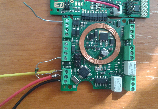 Please not that is is necessary to connect +5V output on the card reader module to both W1 and W0 data connectors of Wiegand interface, both through separate 1kOhm resistor.