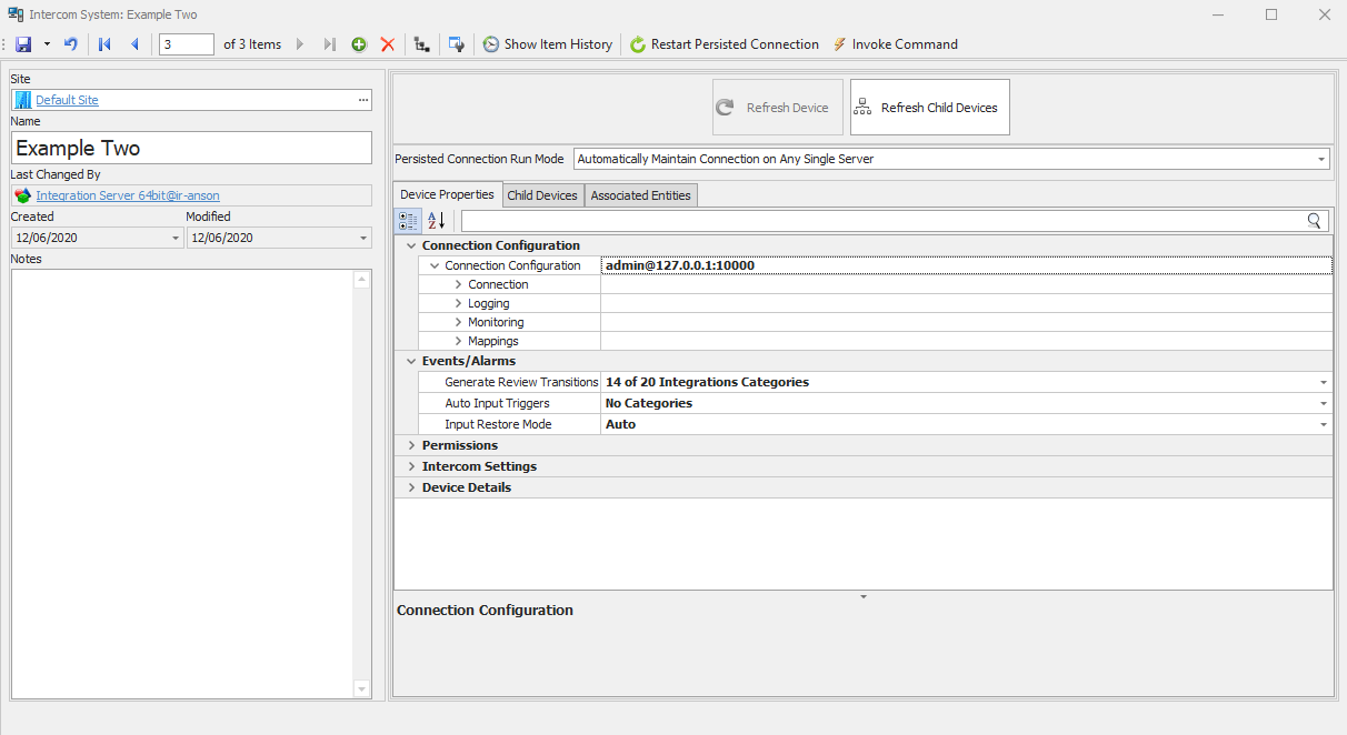Save and close the editor window for the new device and, if enabled, a persisted connection will automatically begin to the 3rd party system and start any monitoring supported by the integration and enabled in the device’s properties.