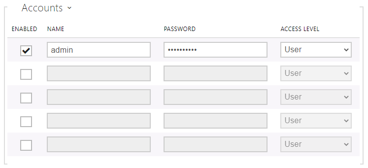 At least one user account should be enabled, and this account can be used in configuring Intercom Points. If possible, monitoring and control should be enabled similarly to services, otherwise an Intercom Point configured with this account will not have that service’s functionality.