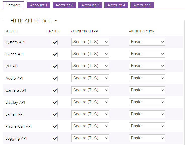 All HTTP API settings can be found within the ‘HTTP API’ section of the 2N Intercom’s service settings. Enabling Services - At an absolute minimum, the System API, Phone/Call API, and Logging API should be enabled for the Intercom System to start up, but it is recommended to enable all services for the full functionality within Integriti. Connection Type - When configuring an Intercom Point in Integriti, make sure the HTTP API services has the same connection type (Secure for HTTPS, Unsecure for HTTP) in Integriti. Authentication Type – As with the connection type, the authentication used should be the same type as you configure in Integriti.