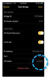 Obtain the IP-Address and the API-Token of Nuki Bridge in the Menu from last step.