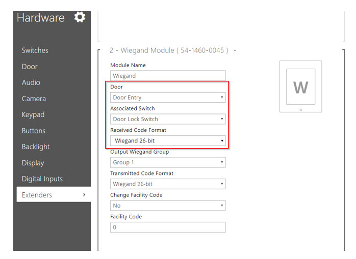 In this case we selected Wiegand 26 bit and ensured that we had assigned the Wiegand input to the desired switch, as well as defining the direction of the reader: