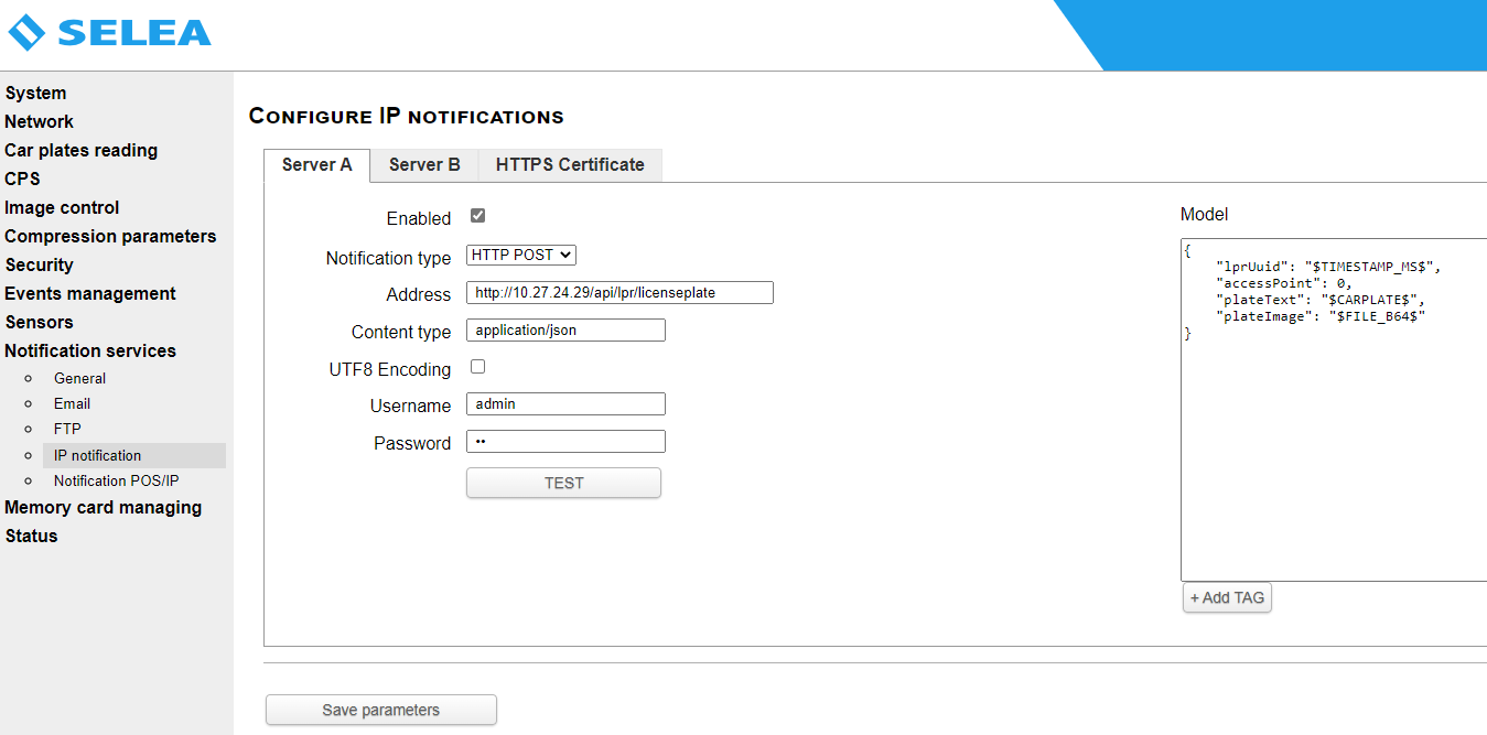 Notification type HTTP POST Address http://IPInterkomu/api/lpr/licenseplate application/json Username Nastaveni interkomu (Services - HTTP API - Account 1) Password Model {