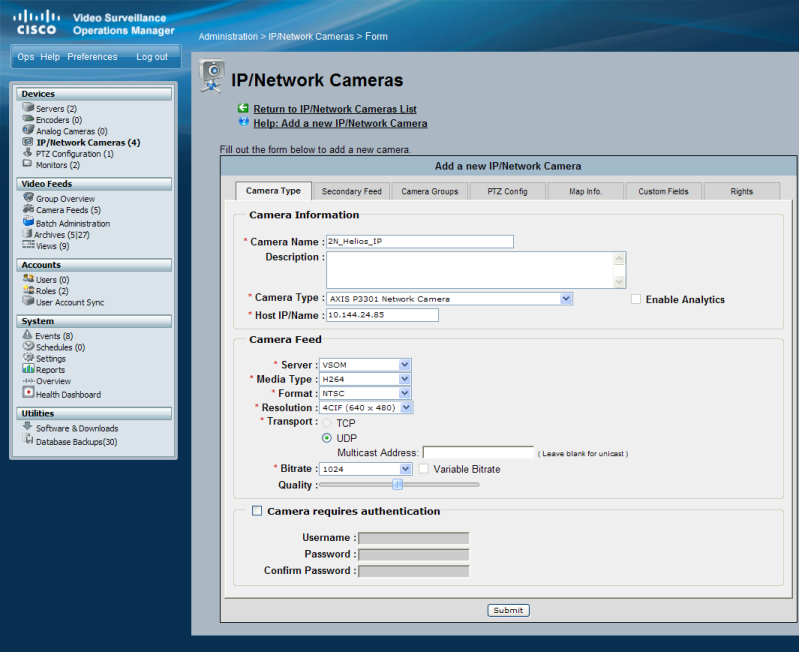 | Cisco Video Surveillance Operations Manager | 2N IP Intercom Version | Scan device | Video from 2N IP Intercom | Audio from 2N IP Intercom | Audio to 2N IP Intercom | Switch control | Events from 2N IP Intercom |