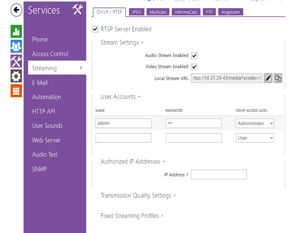 Enable parameter ONVIF/RTSP Server Enabled in menu Services / Streaming.