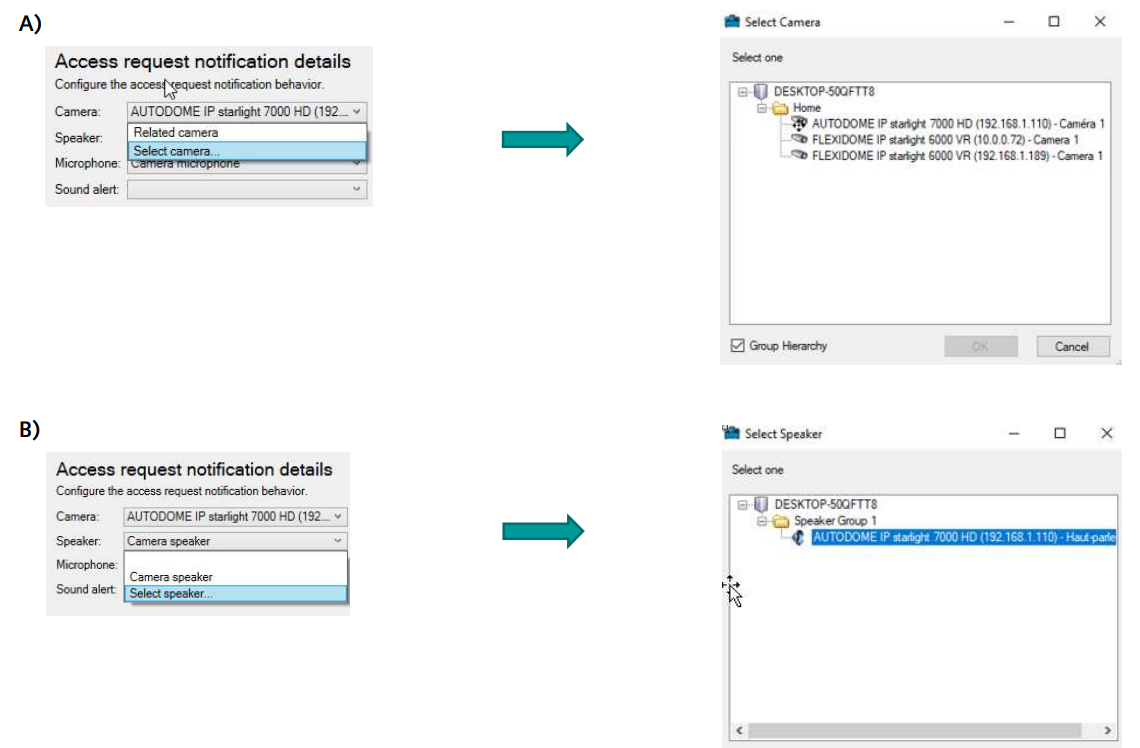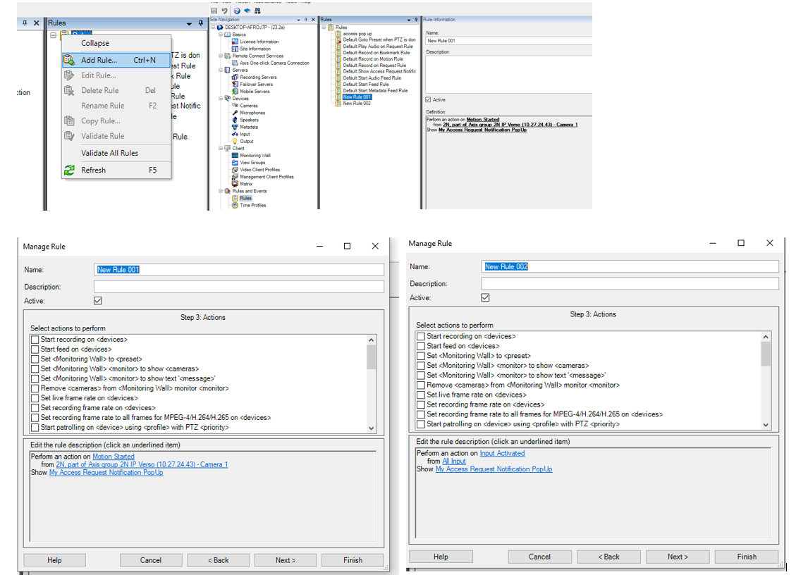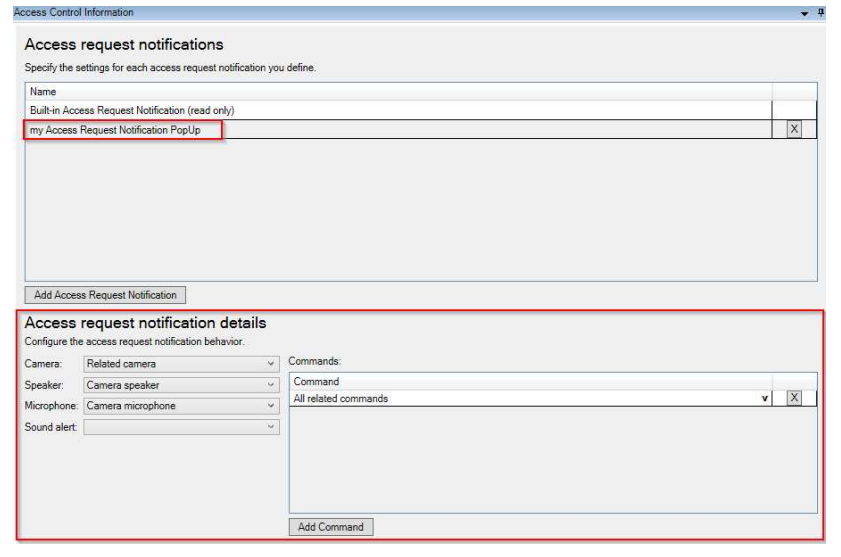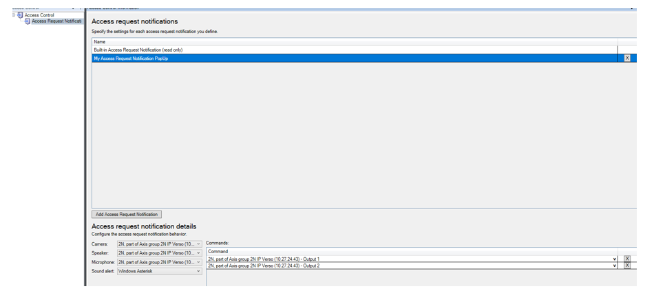 The Access Request Notifications plugin is meant to integrate in Siveillance Video. Once the plugin is well configured with a specific camera, microphone, and a triggering event, then it is possible to show pop-up windows in the Video Client with live video and audio feed. For example, this can be useful to establish an audiovideo communication between Video Client and an intercom.