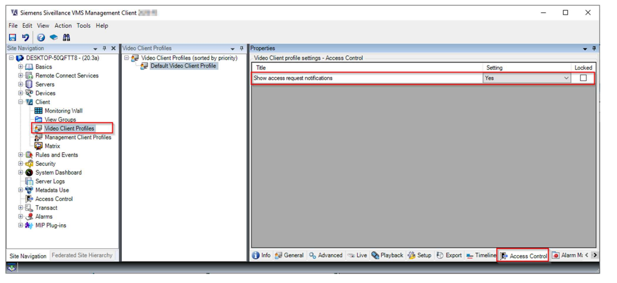 In Management Client, you will find this setting in Video Client Profiles under the Access Control tab: