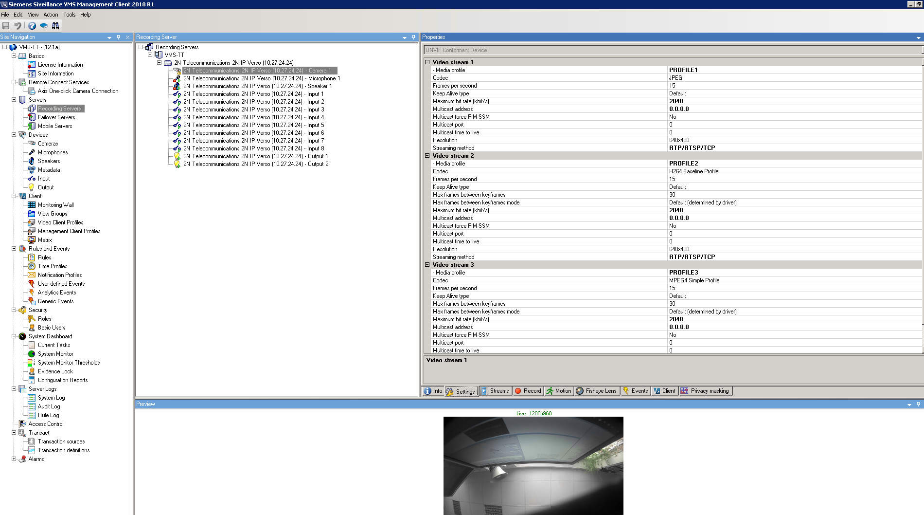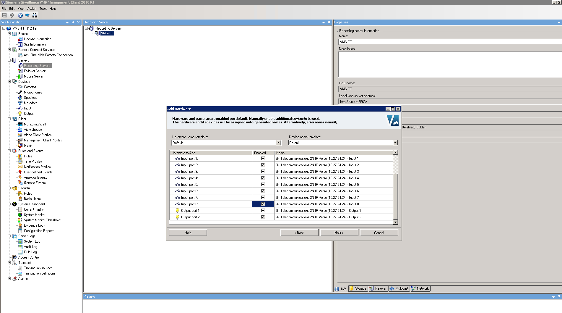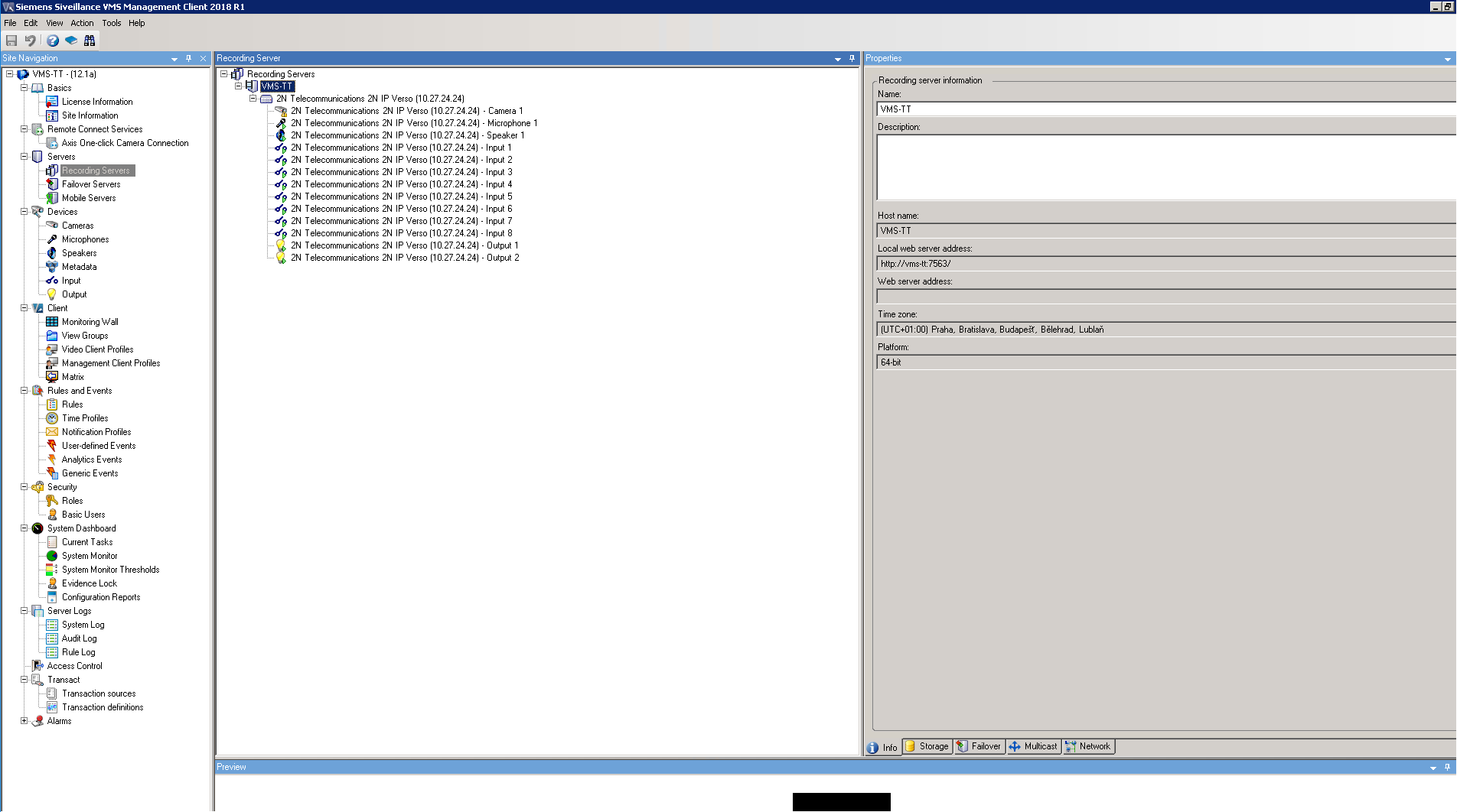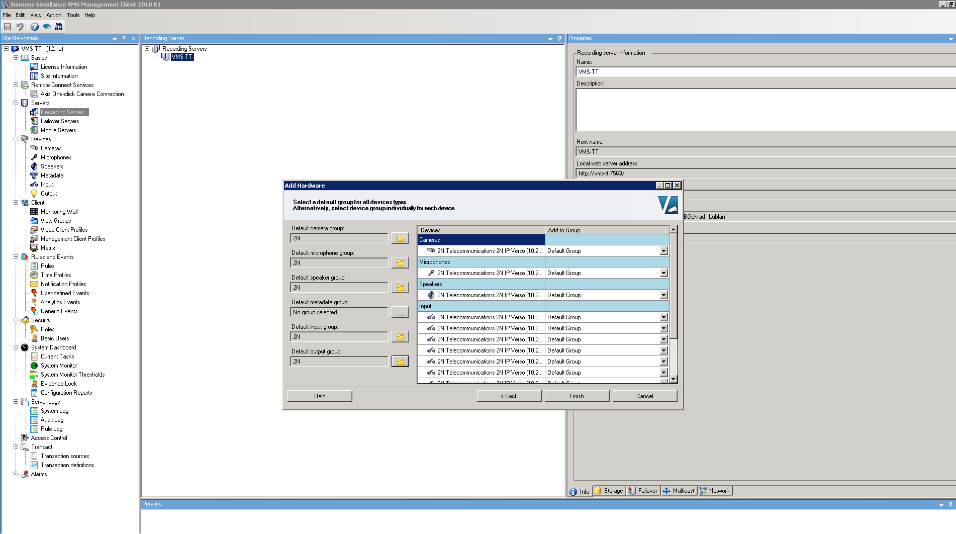 Once the procedure is finished, you will see added devices and their peripheries. You can also add the peripheries you did not add before to groups (not added peripheries are marked with red cross). Optionally you can rename the device and also the peripheries here. Also you will see video from camera here. If Siveillance is not able to connect to the camera, then please check your firewall settings!