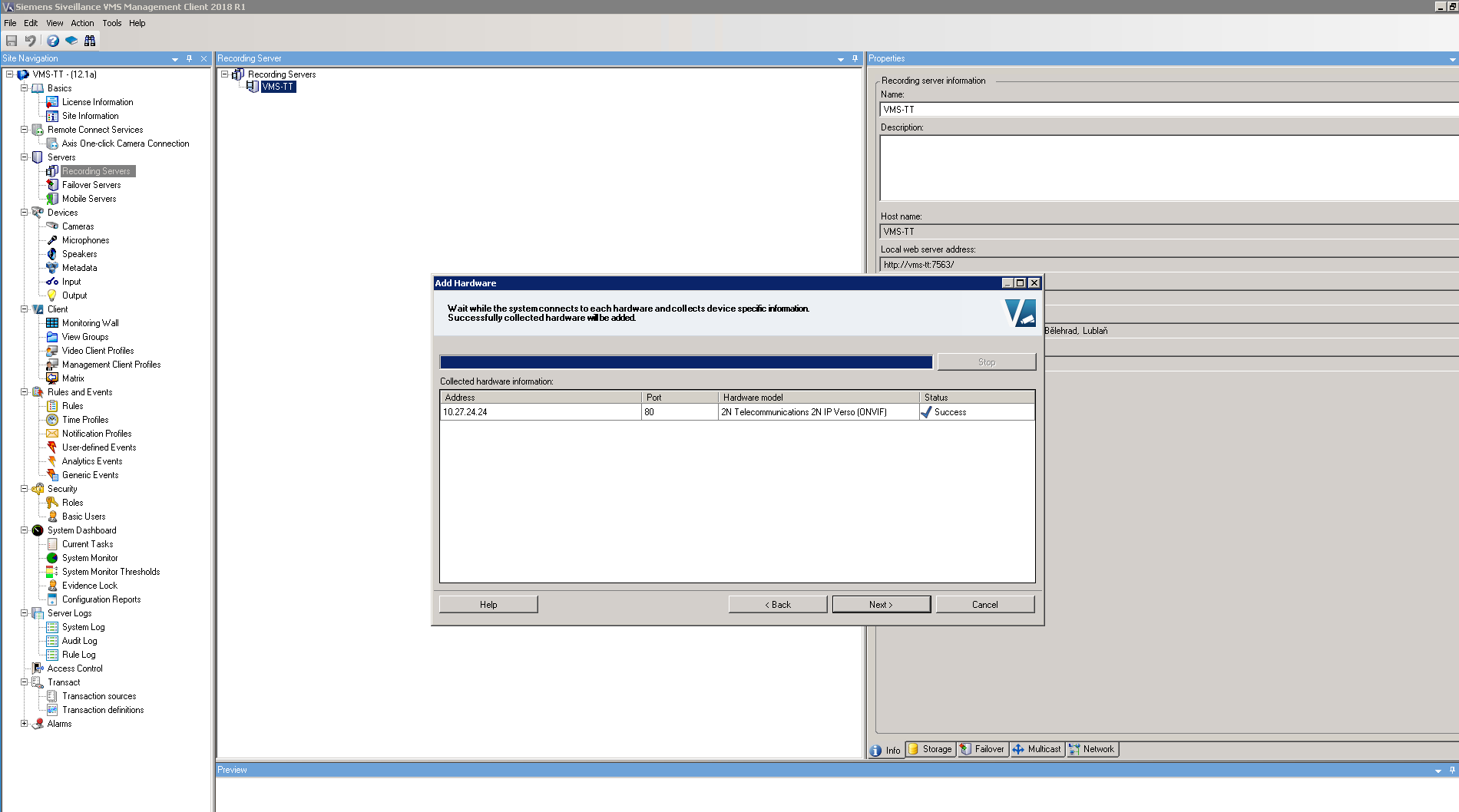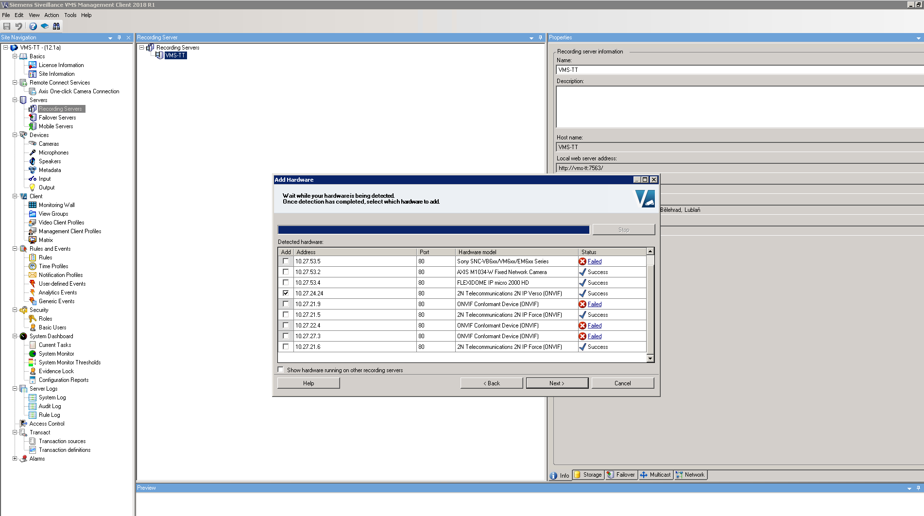 Now Siemens Siveillance VMS will search for ONVIF devices in your network, once the intercom will be found, it will appear with label "Successfull". If intercom is not checked, then please do so and click on "Next".