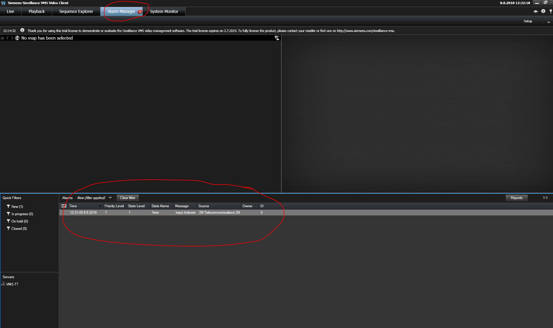 When the input is activated, the alarm event will appear in the Siveillance VMS Video Client.