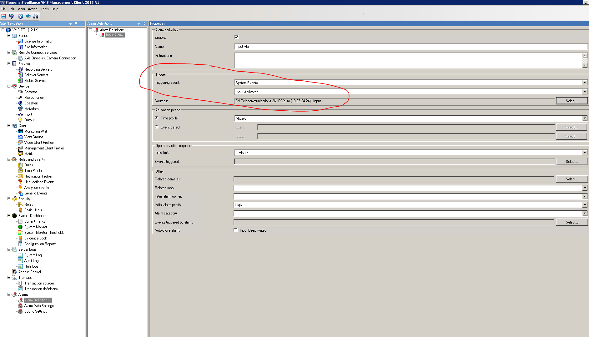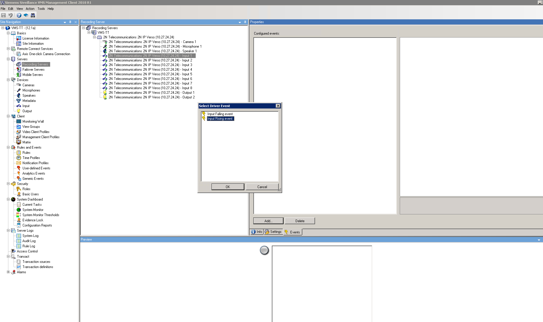As an example an alarm raised when 2N IP Intercom digital input is activated will be configured. Alarm will be raised when a Hardware Input Event is registered in Siveillance VMS. Add Input Rising Event and Input Falling Event for correct function alarm.