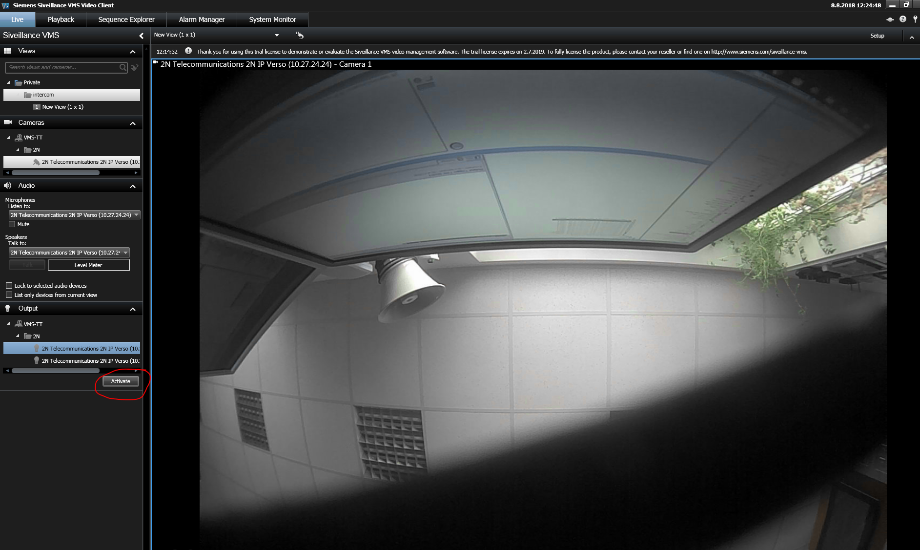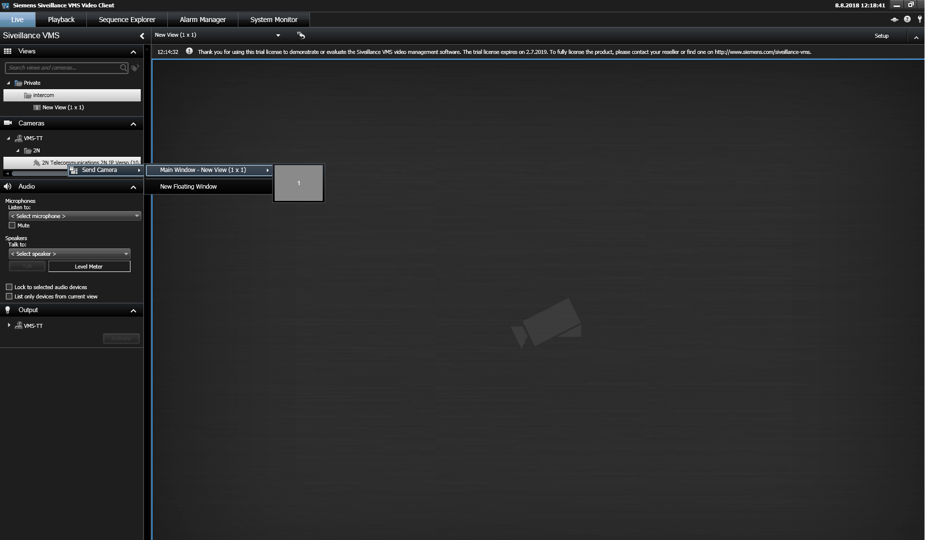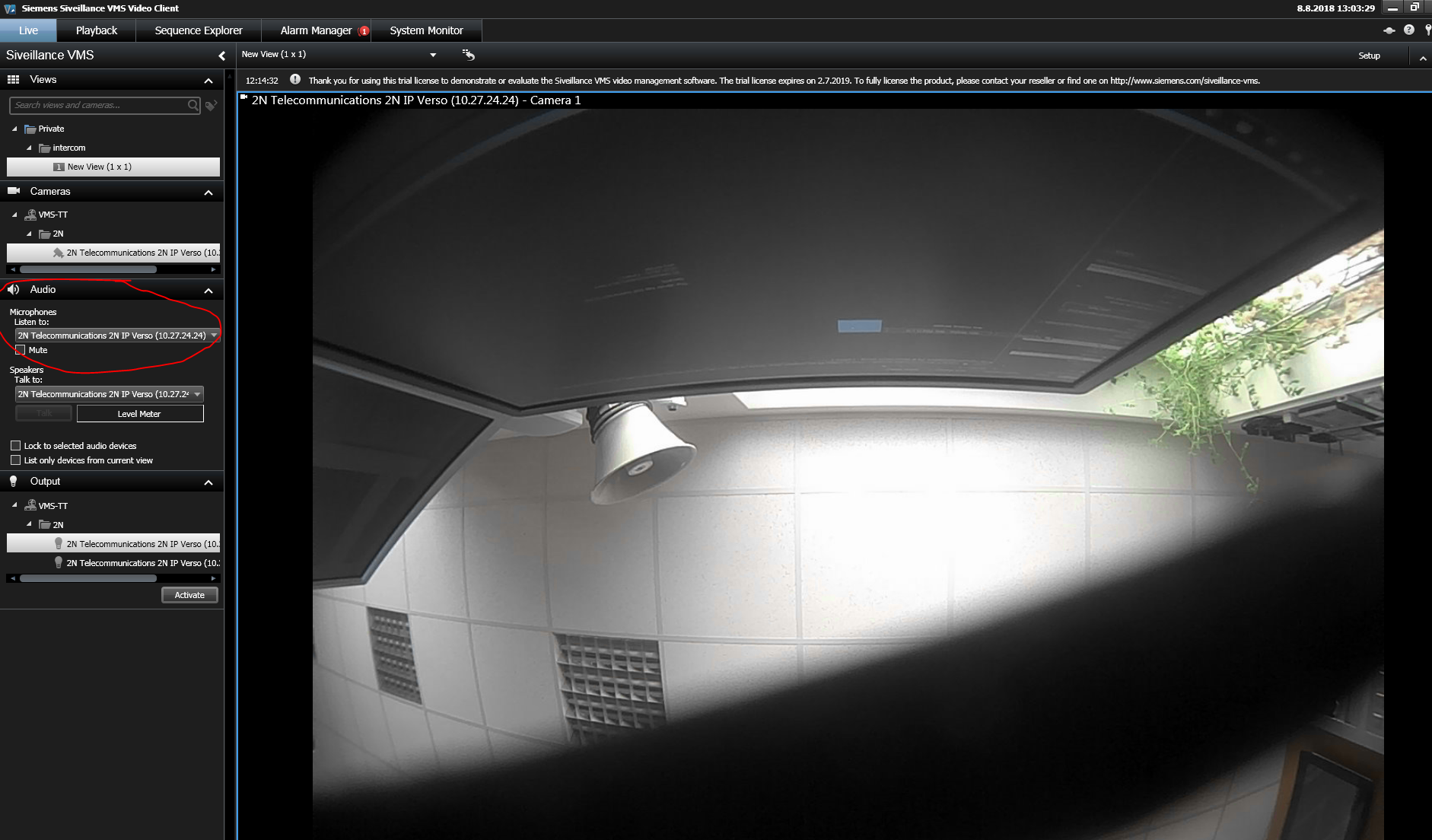 In the Siveillance VMS Video Client you should talk to 2N IP Intercom. After you add your camera, drag selected camera and drop it into your View from the camera tree. And then you can press button and talk.