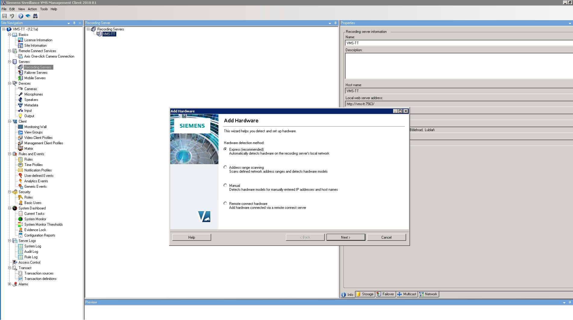 On the side of Siveillance server go to section "Servers/Recording servers". Do a right click on your recording server and choose "Add Hardware" (if server is not authorized yet, then you have to click on "Authorize first"). Now click on "Add" to add a new device fill credentials that you choosed for Onvif account in the intercom (in our case it is ONVIF/ONVIF). Then click on next.