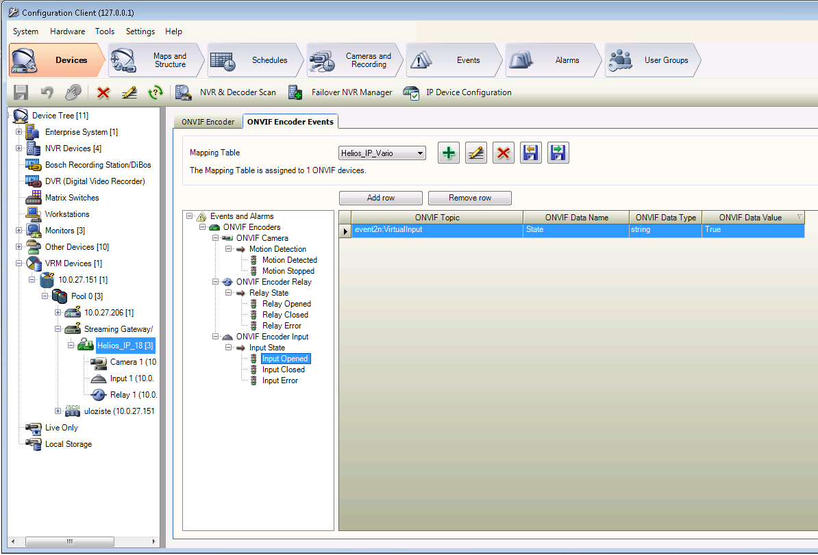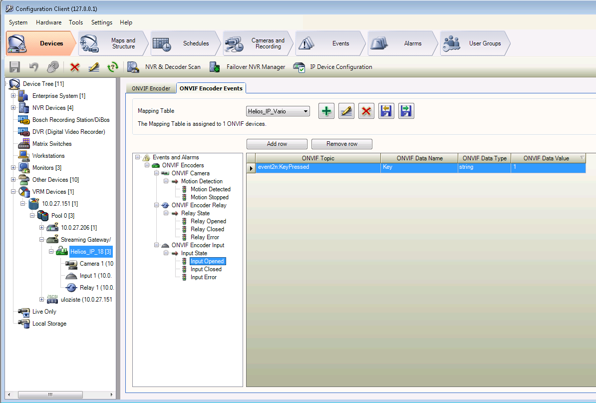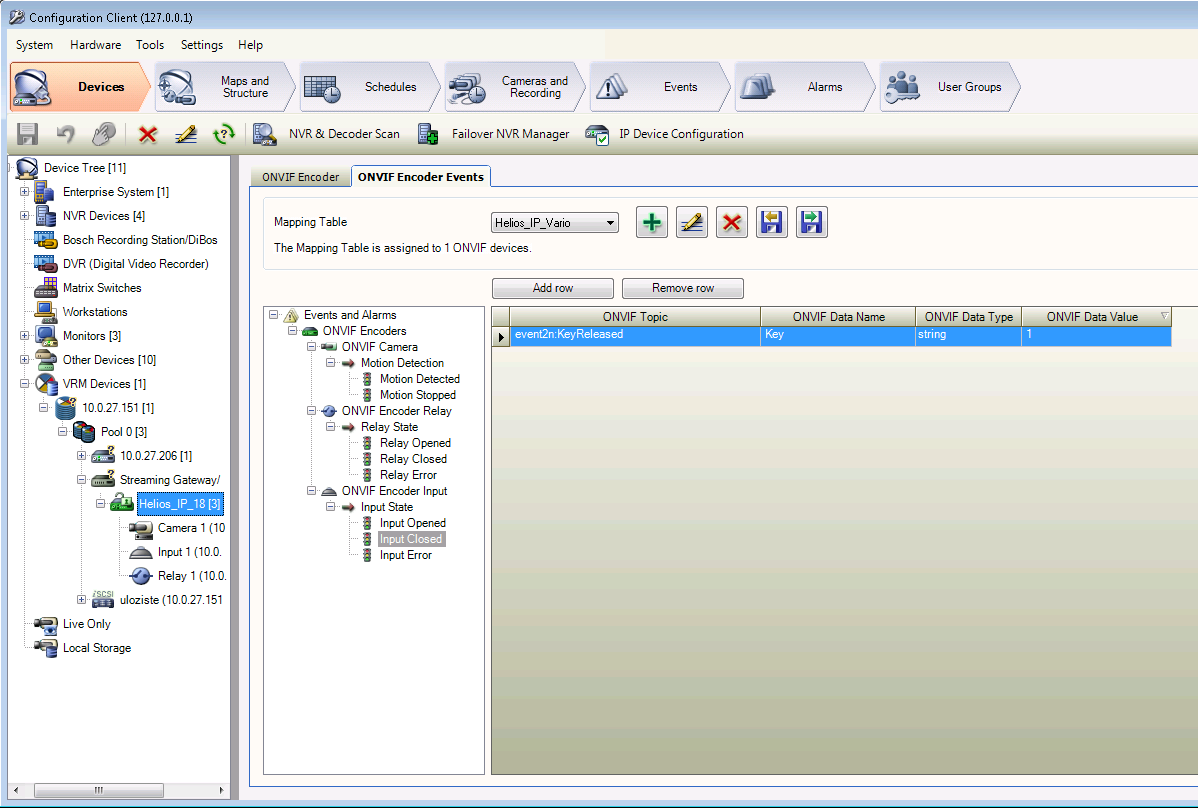 Otevřte Konfiguračního klinte, zvolte menu Devices, položku Device Tree / VRM Devices / VRM (10.0.27.151) / Pool / Streaming Gateway / Helios IP (18), Card ONVIF Encoder Events.