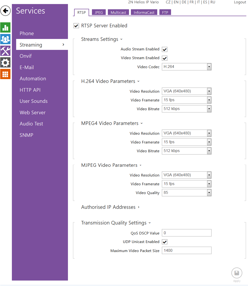 V dalším kroku je třeba povolit RTSP streamování, tj. odesílání videa z vrátníku na nějaké zařízení třetí strany. Toto nastavení je v sekci "Služby – Streamování – RTSP", kde musíte zaškrtnutím povolit RTSP server a také streamování videa. Na závěr vyberte video kodek H.264 a povolte UDP unicast. Veškerá tato nastavení jsou znázorněna na obrázku níže.