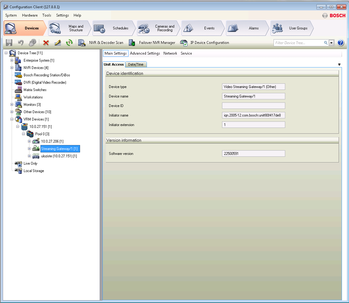 Otevřte Konfiguračního klienta, odtud dále do záložky "Devices" položka Device tree / VRM Devices / VRM (10.0.27.151) / Pool / Streaming Gateway.