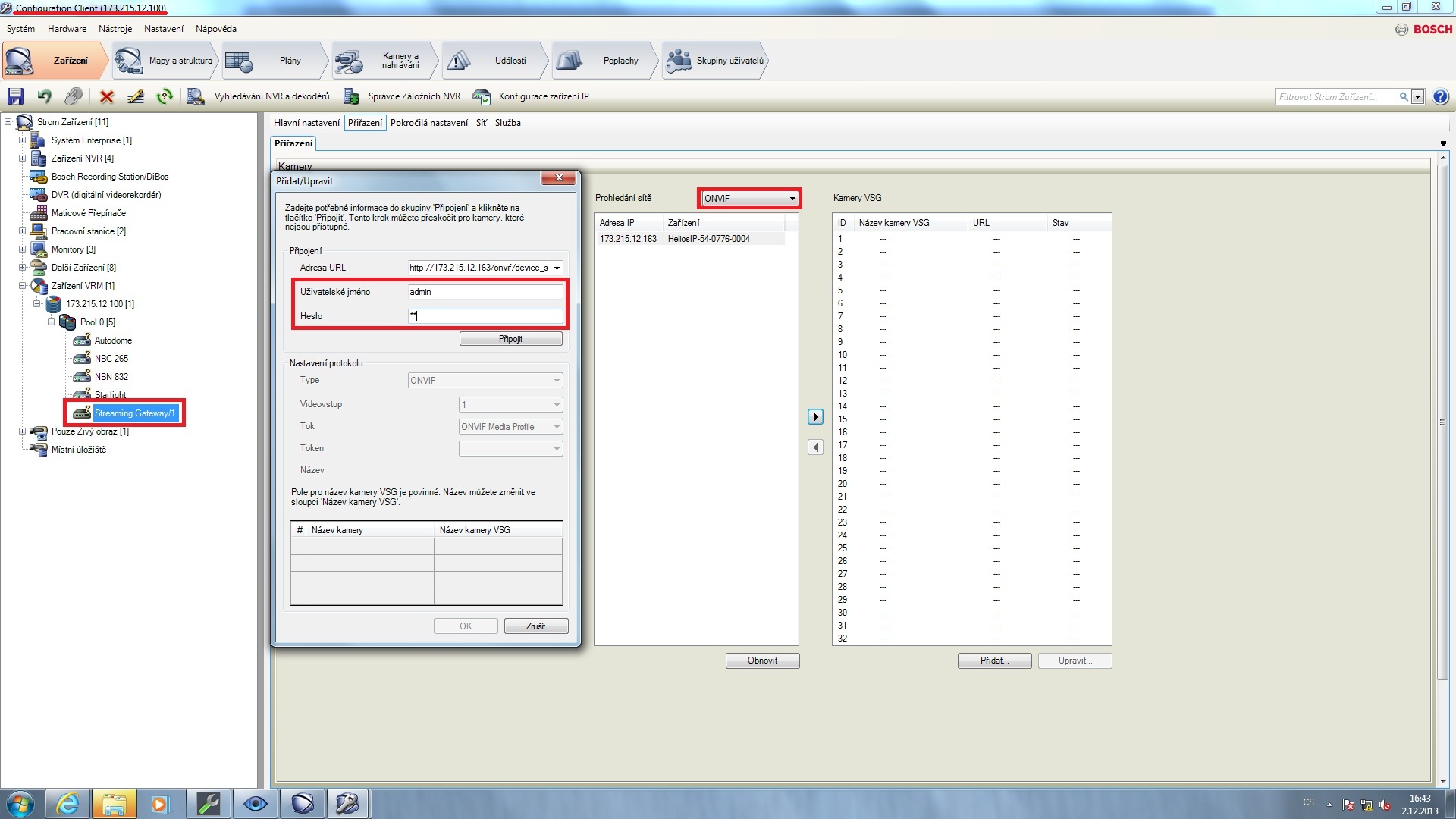 Jakmile si otevřete konfiguračního klienta (Configuration Client) od fy. Bosch, přejděte do menu "Zařízení" umístěného v horní liště nástroje a v sekci "Zařízení VRM" si vyberte úložiště (v našem příkladu byla pro vrátník 2N® Helios IP vytvořena tato cesta: "VRM devices – IP_address_of_VRM – Pool – Streaming Gateway"). Vše je znázorněno na následujícím obrázku. V pravé části obrazovky dojde k prohledání celé Vaší sítě a Vy uvidíte veškerá nalezená zařízení podporující protokol Onvif. V našem příkladu byla nalezena pouze kamera z vrátníku 2N® Helios IP s adresou 173.215.12.163. Po rozkliknutí tohoto zařízení vyplňte přihlašovací údaje (admin : 2n) a klikněte na tlačítko "Připojit".