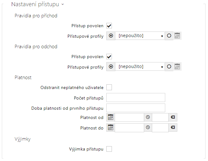 Platnost do– umožňuje nastavit konec platnosti nastaveného přístupu.Ponechte prázdné, aby nebyl konec omezen. Platnost do musí být po Platnost od.