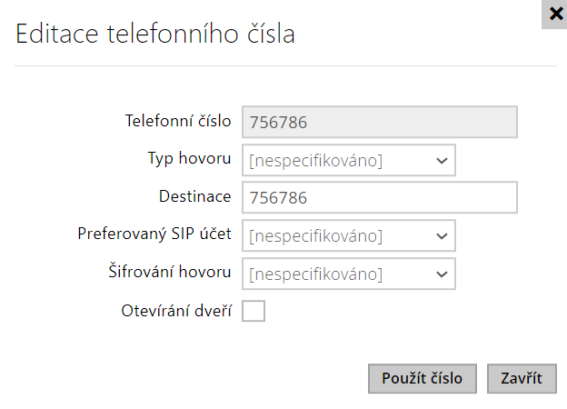 Telefonní číslo – telefonní číslo stanice, na kterou má být hovor směrován. Pro tzv. přímé SIP volání zadejte adresu ve tvaru sip:[user_id@]doména[:port], např.: sip:200@192.168.22.15 nebo sip:jmeno@vasefirma. Pro volání na mobilní aplikaci 2N IP Mobile zadejte device:název_zařízení. Název zařízení si nastavíte v mobilní aplikaci. Pro volání na zařízení Crestron zadejte adresu ve tvaru RAVA:device_name.Pokud za telefonním číslem uvedete znaky /1 resp. /2, pro odchozí volání se explicitně použije SIP účet 1 resp. 2. Přidáním /S je možno vynutit šifrovaný hovor, /N nešifrovaný. Přidáním /B se aktivuje funkce otevření dveří zpětným voláním. Volbu účtu, šifrování a otevření zpětným voláním současně je možno zadat např. jako /1S, /1B atd. Parametr může obsahovat až 255 znaků. Detailní nastavení telefonního čísla je možné provést v editaci, která se otevře kliknutím na .