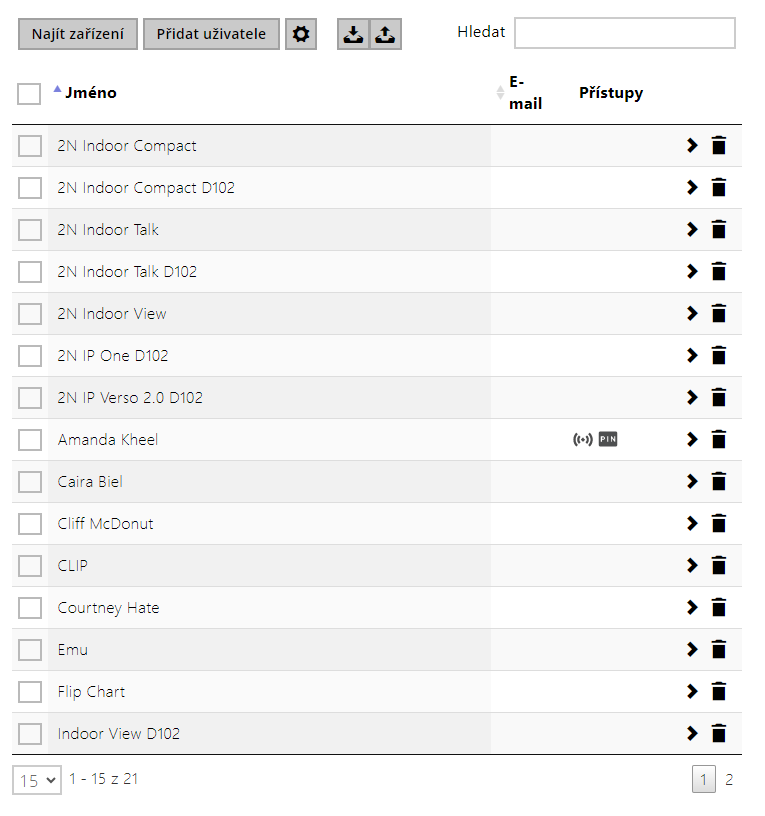 Seznam uživatelů obsahuje uživatele, kteří mají být přístupní pomocí tlačítek zrychlené volby (lze na ně volat), ale zároveň i uživatele, kteří mají mít pouze přístup do objektu pomocí RFID karty, kódu apod.