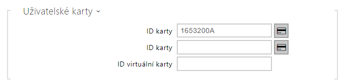 ID karty – umožňuje nastavit ID přístupové karty uživatele. Každý uživatel může mít přiřazeny max. dvě přístupové karty. ID přístupové karty je sekvence 6–32 znaků z množiny 0–9, A–F. Po přiložení platné karty ke čtečce dojde k sepnutí spínače asociovaného s příslušnou čtečkou karet. V případě, že je navolen režim dvojité autentizace, dojde k sepnutí spínače daného zadaným numerickým kódem po přiložení karty.