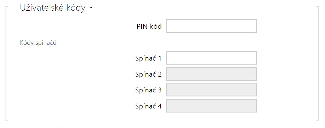 Spínač 1–4 – umožňuje nastavit soukromý kód uživatele pro sepnutí spínače. Kód může být až 16 znaků dlouhý a může obsahovat pouze číslice 0–9. Kód musí obsahovat alespoň dva znaky pro odemknutí dveří z klávesnice interkomu a minimálně jeden znak pro odemknutí dveří pomocí DTMF z telefonu.