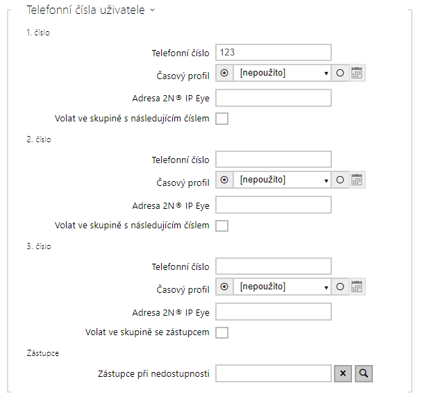 Časový profil – umožňuje přiřadit k telefonnímu číslu časový profil a tak řídit jeho platnost. Pokud profil není aktivní, telefonní číslo není použito a pro volání se použije následující telefonní číslo, pokud je definováno.