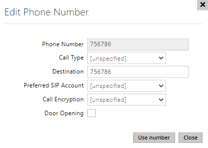 Virtual Number – you can use the virtual number for calling a user via the numeric keypad on the device. The virtual number can have 1 to 7 places. The first/last place can be either a digit or a letter, the remaining positions can only be digits (A123, 456B, C12E, e.g.). Virtual numbers can be set according to apartment numbers, for example. Virtual numbers are especially convenient for installations where the speed dial buttons are insufficient. Not being related to the actual user phone numbers, virtual numbers help protect the user phone numbers on the device.