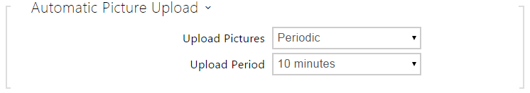 - Upload period – set the picture sending period in steps (10 seconds to 30 minutes) when Upload pictures is set to Periodic.