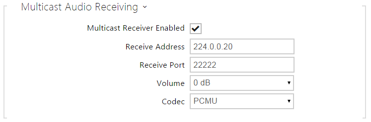 - Multicast receiver enabled – enable receiving of RTP packets on the selected multicast address and port. The audio stream received is played during an active call too and the sounds from the two sources get mixed.