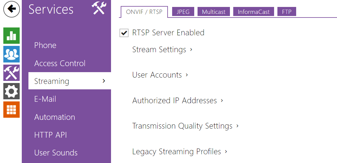 The 2N LTE intercoms integrate an RTSP server, which can be configured in this tab. The RTSP server allows for audio/video streaming. You can choose the data transmission method, video compression method/parameters and other parameters associated with transmission security and quality.