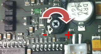 Povolte mírně čtveřici šroubků a kryt posuňte směrem dolů. Nyní můžete sundat kryt. Pomocí trimru, který se nachází na spodní části elektroniky, nastavte požadovanou hlasitost (viz obr.).
