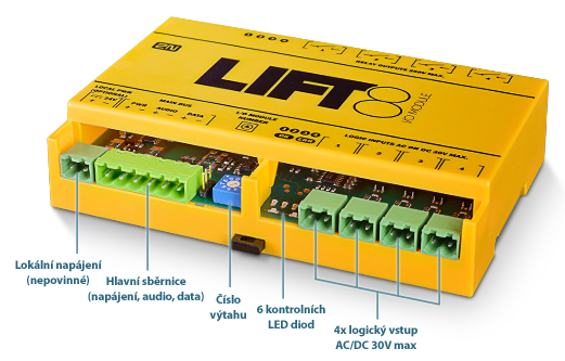 I/O Modul slouží k propojení centrální jednotky se signalizací daného výtahu. Modul je určen pro využití binárních vstupů, případně pro spínání reléových výstupů. Na centrální jednotku je připojen 6 vodiči (napájení, audio, data). Jednotlivé vstupy a výstupy jsou k I/O Modulu připojeny pomocí dvoupólových nasouvacích svorek.